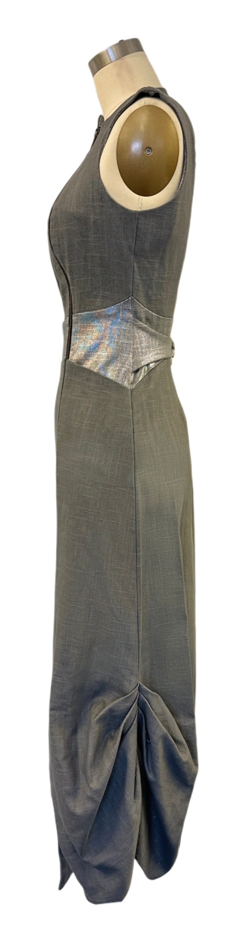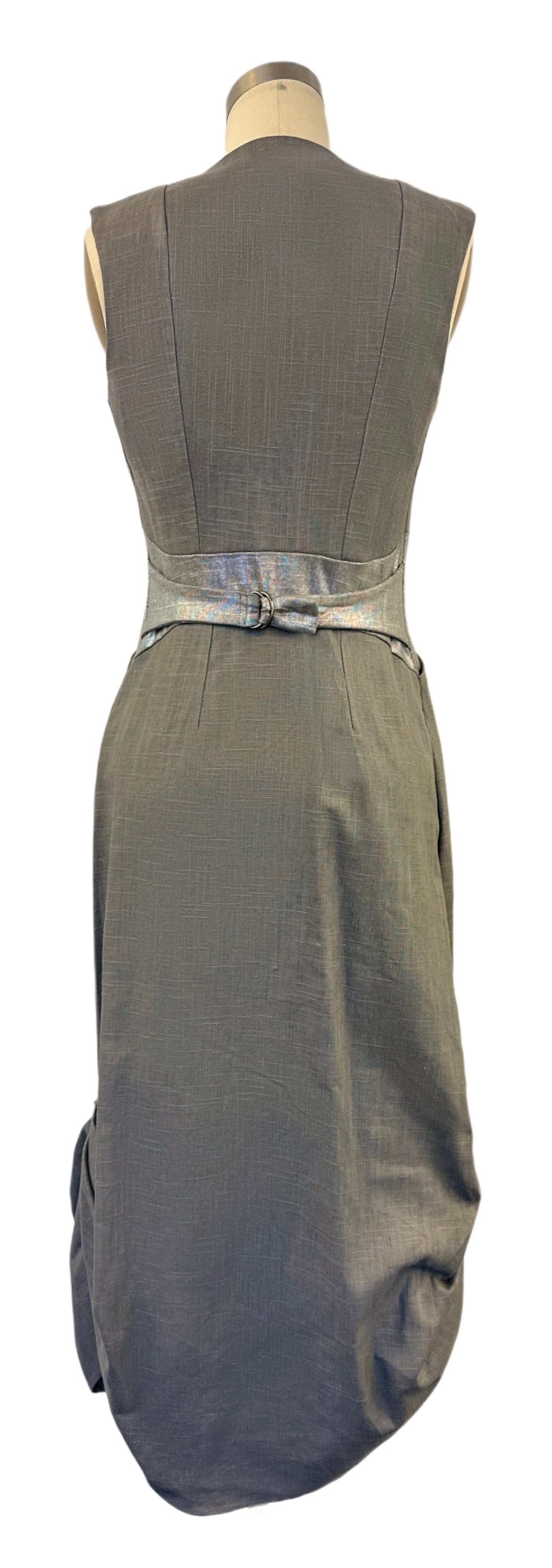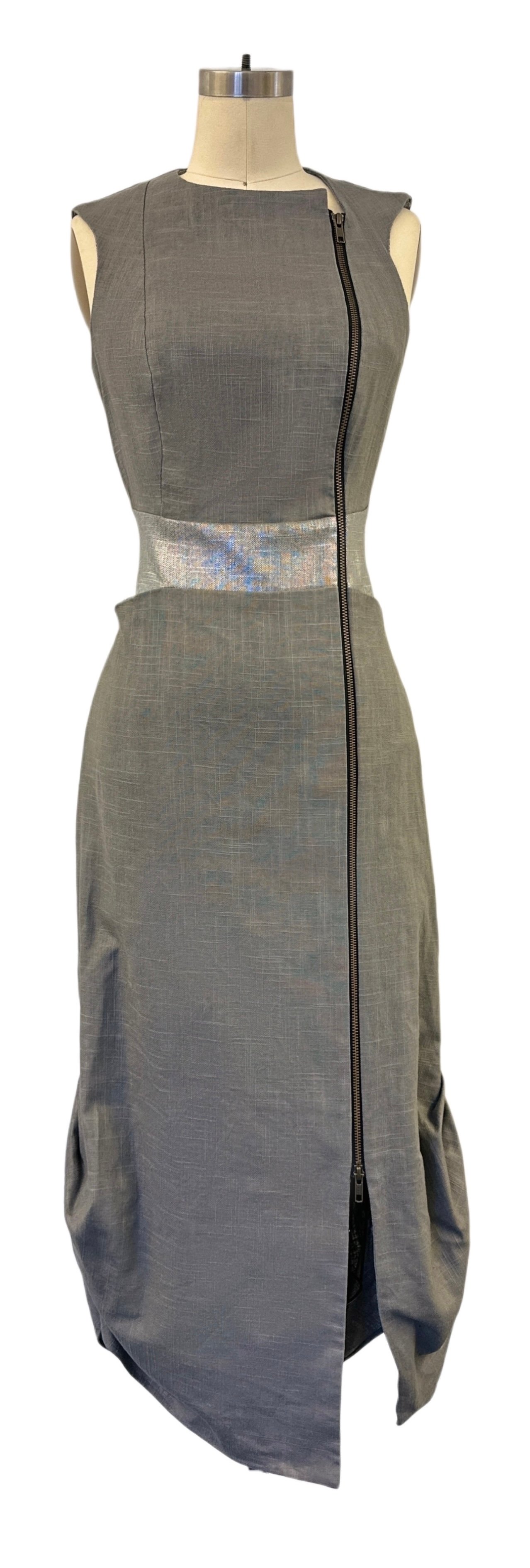 This gray beauty with silver accents features a modern asymmetrical neckline and a bold two-way diagonal zipper—because one way simply isn’t enough. The tailored fit is complemented by a cinching belt at the back (hello, perfectly snatched waist), while the softly draped hem brings just the right amount of drama. Polished, a little edgy, and effortlessly cool.