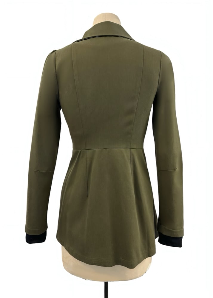 Keywords: cotton jacket, olive jacket, tailored blazer, side zipper jacket, women’s structured jacket, sporty cuffs, modern blazer