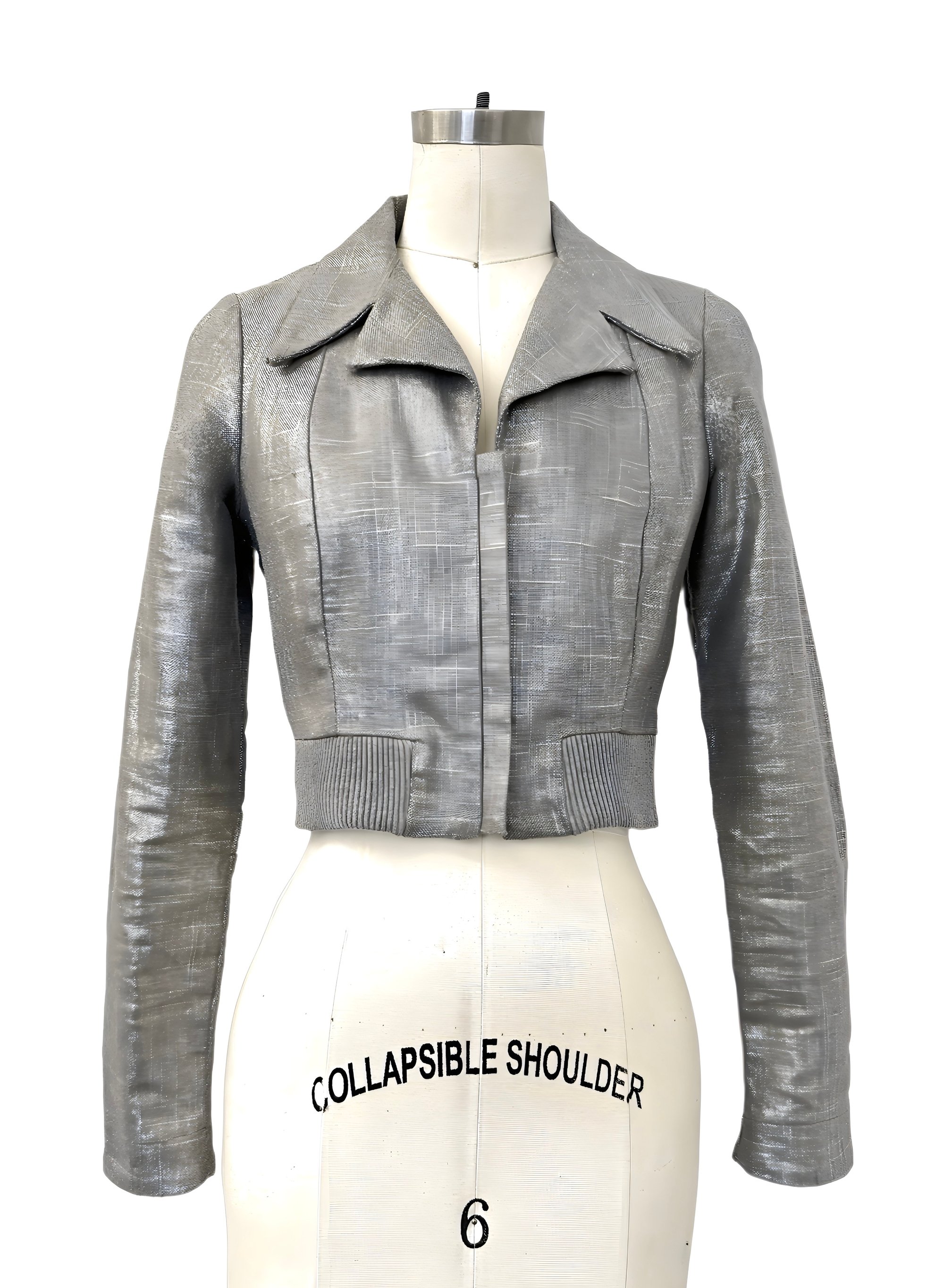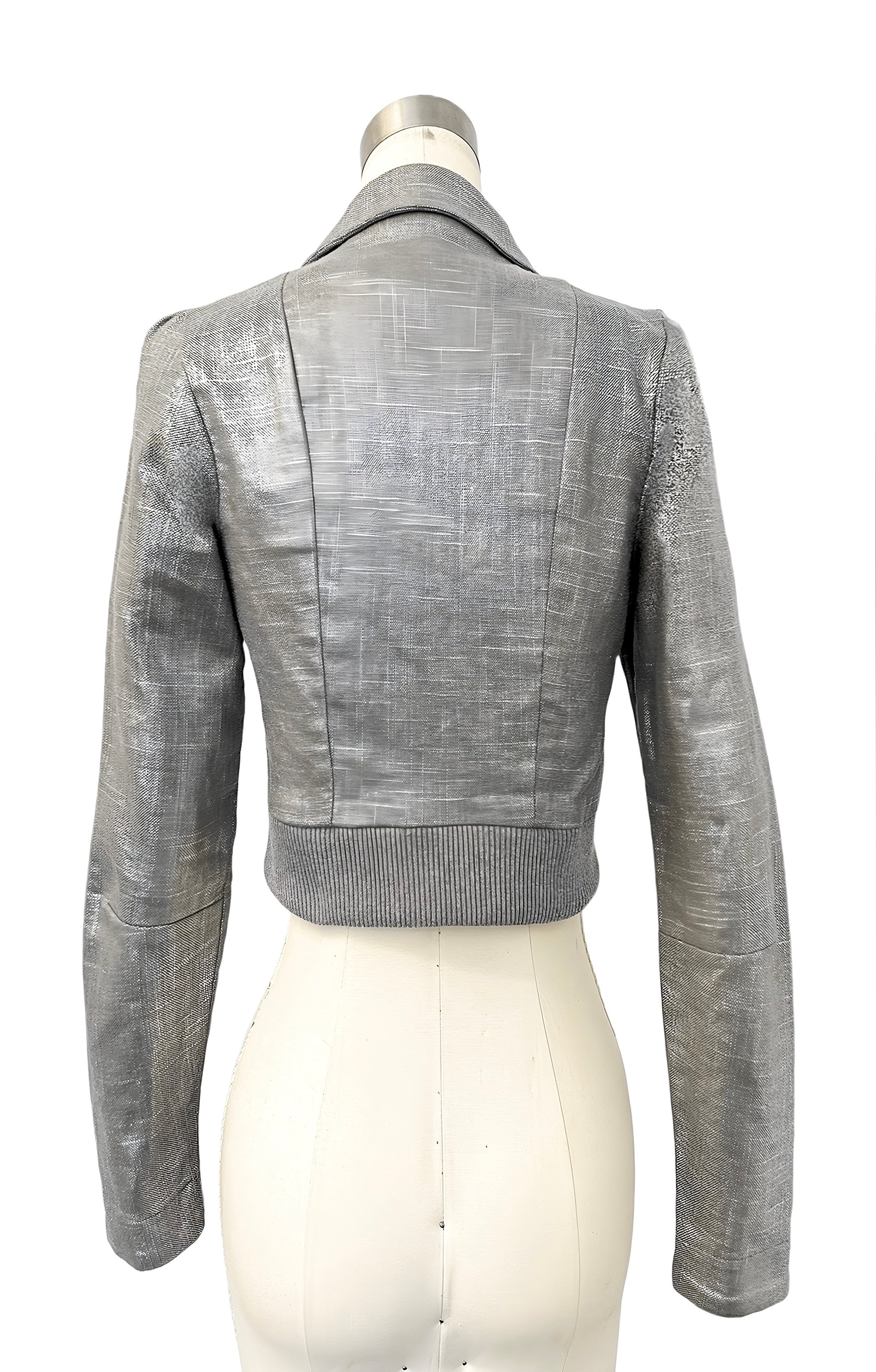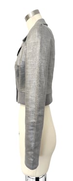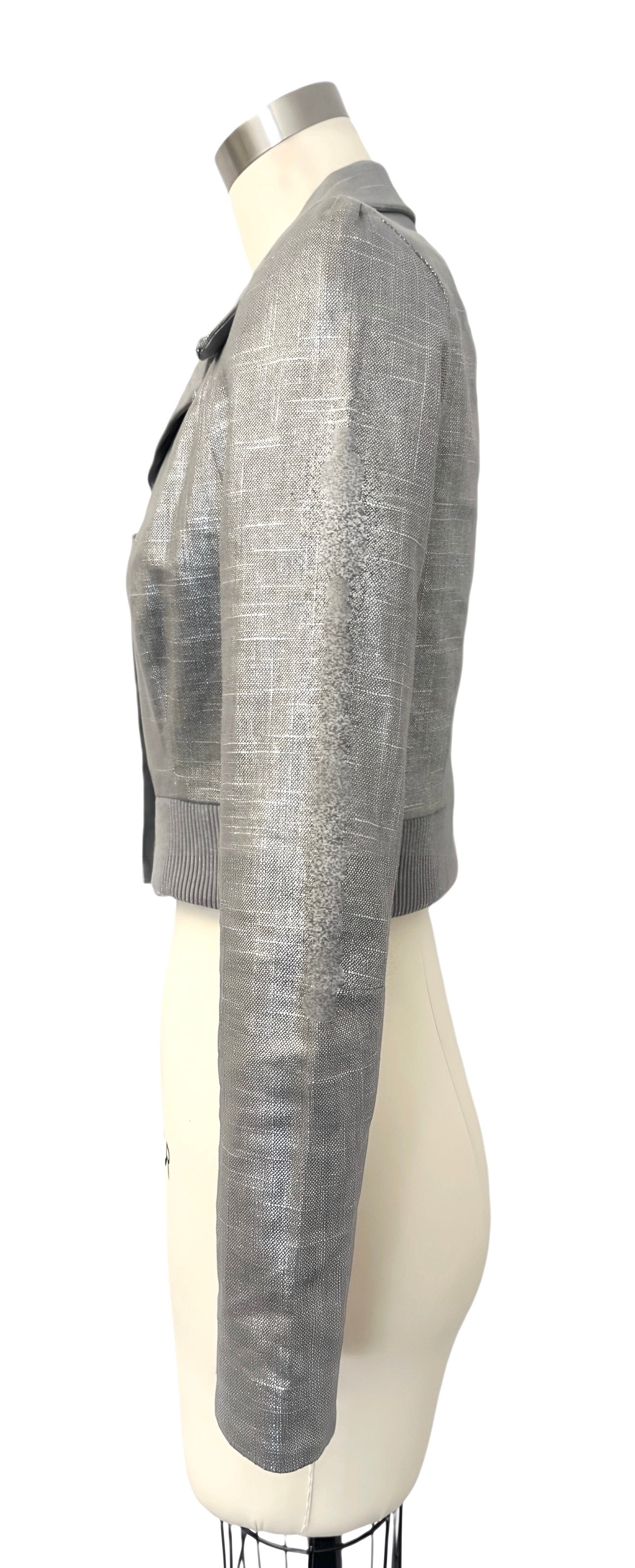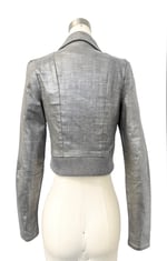 This jacket features a silver cross-hatched fabric that has a subtle shimmer.